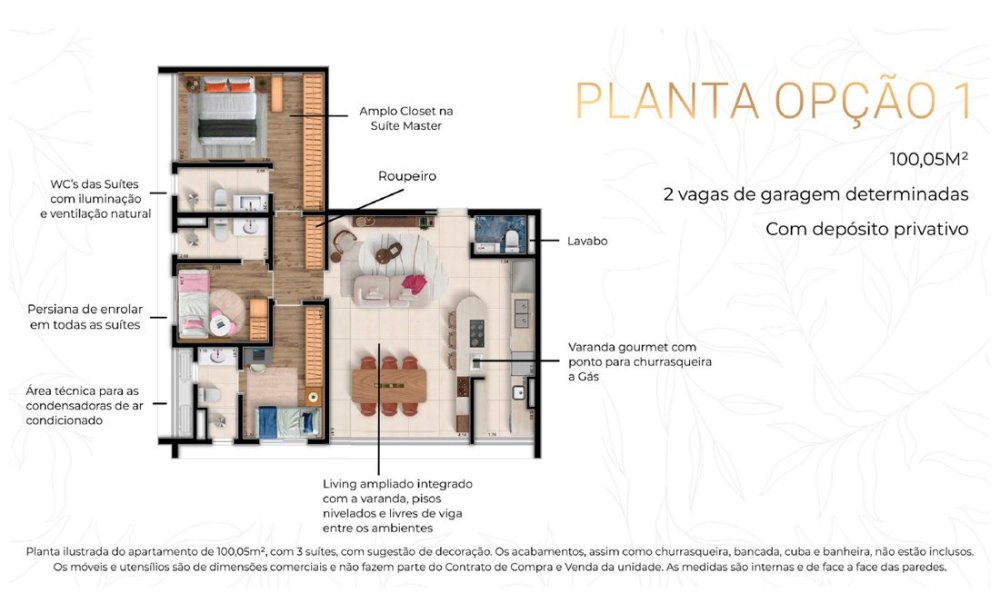 Empreendimento sucinto e direto, eu diria, porque é um terreno compacto de 1.900m² aproximadamente, que sustenta tudo que você precisa no dia a dia, torre unica com 3 aptos por andar ( na verdade são 4, porém, uma das prumadas são studios - que não se conecta e nem usarão a área comum do prédio - ), com plantas maravilhosas e 100% aproveitaveis de 100m² com 3 ou 2 suítes, todos os banheiros com janelas, e plantas convencionais (permite que você mude totalmente o layout), além de 2 vagas determinadas + depósito.
